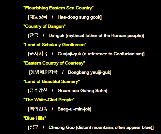 Over the millennia, Korea has been nicknamed by many historians, poets, and travelers. A few nicknames are listed below (Hangeul script may not appear without font support.):